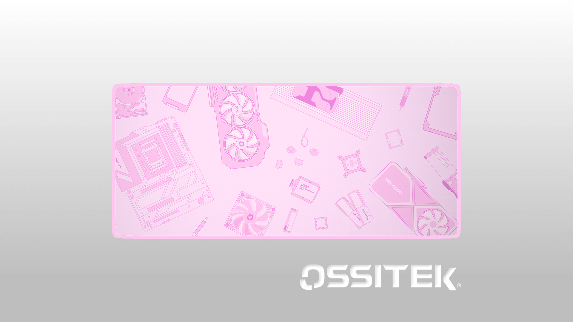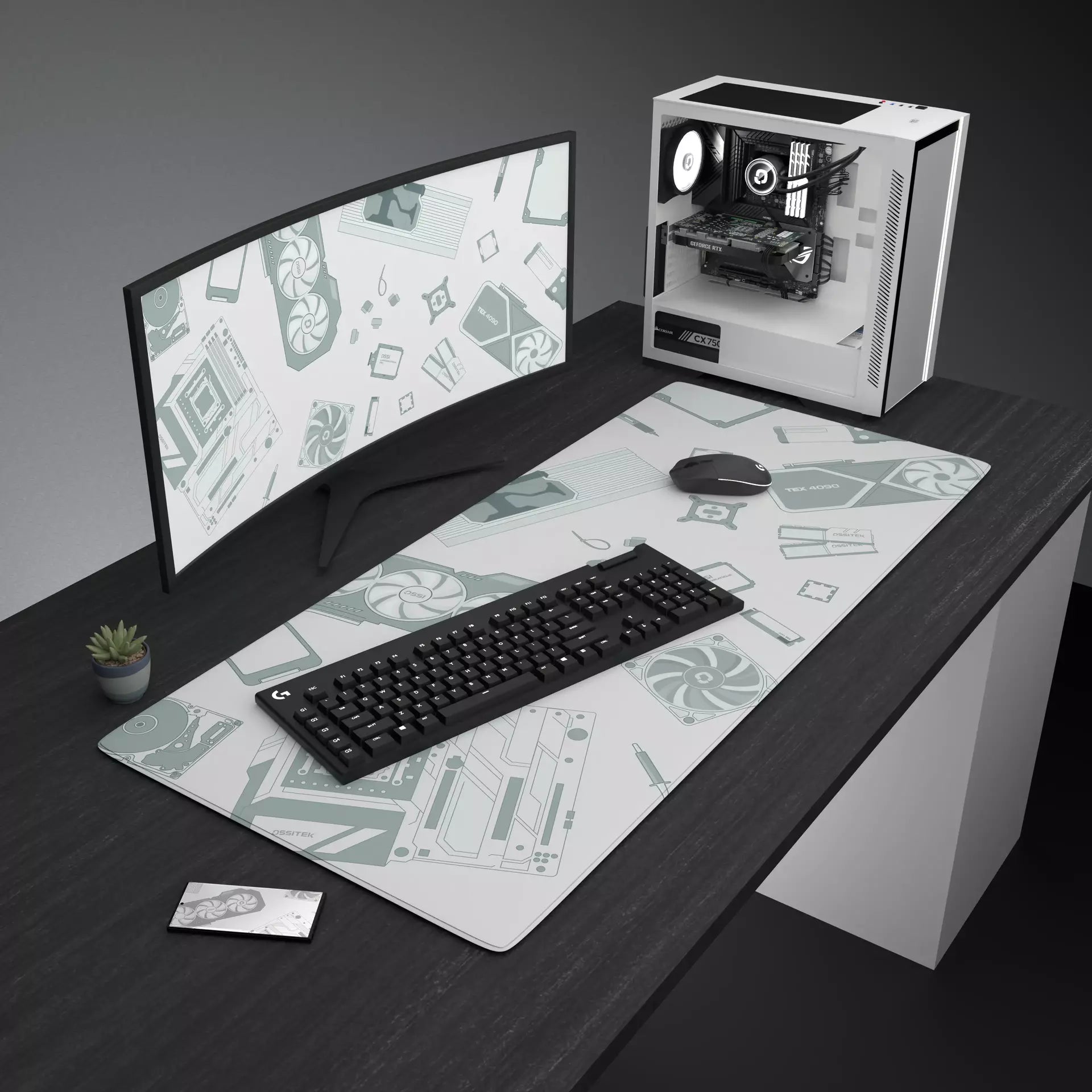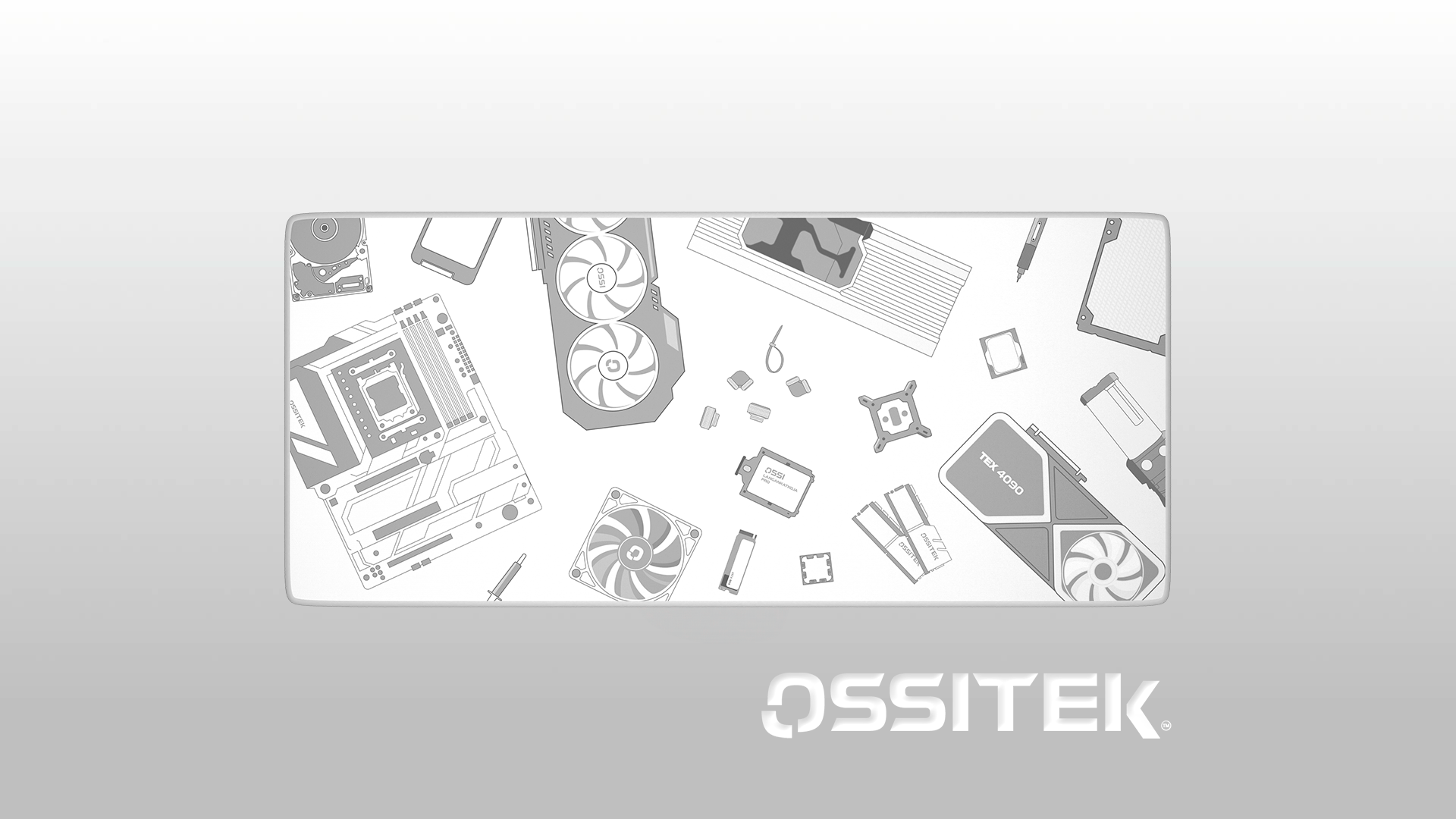 Pelihiirimatto, joka sopii valkoisen ja harmaan sävyjen kanssa täydellisesti pelisetuppiisi! Kuvitettu tyylikkäästi tietokoneen komponenteilla, tuomaan hienoja yksityiskohtia pöydällesi!